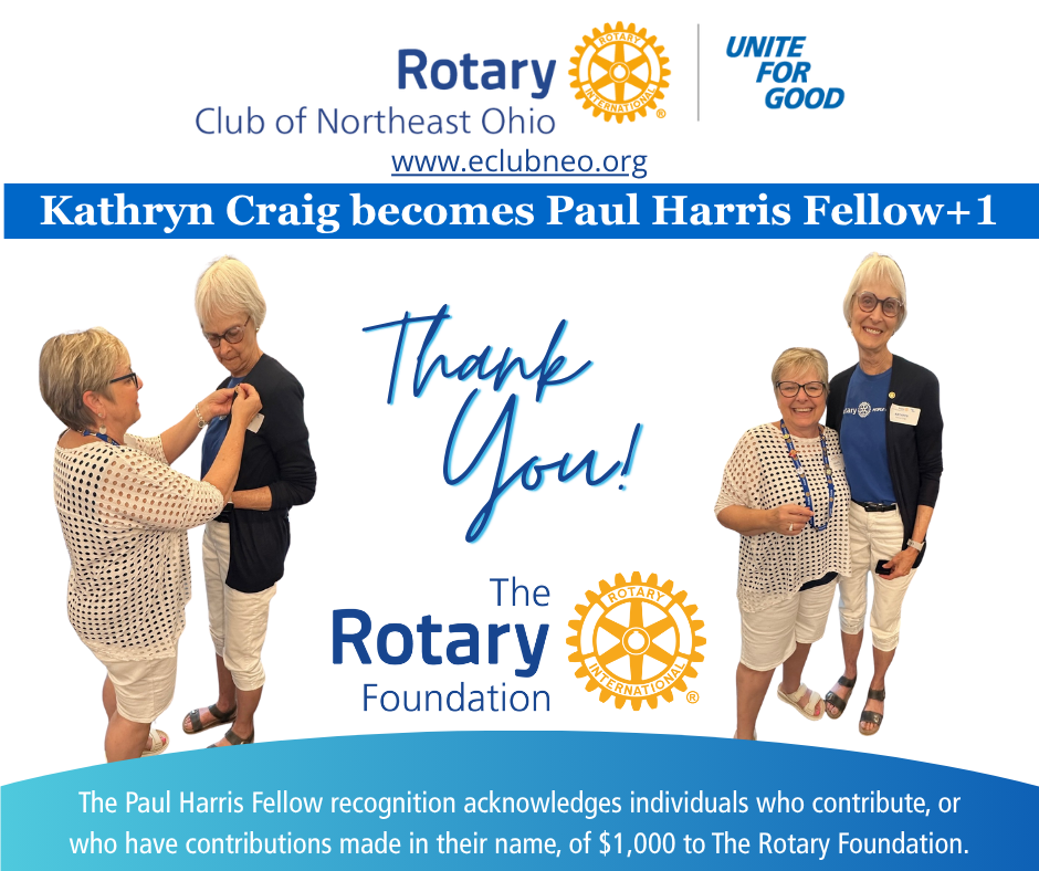 Past Club President Kathryn Craig receives her Paul Harris +1 pin from Immediate Past President Celeste Rininger. Congratulations and Thank You!